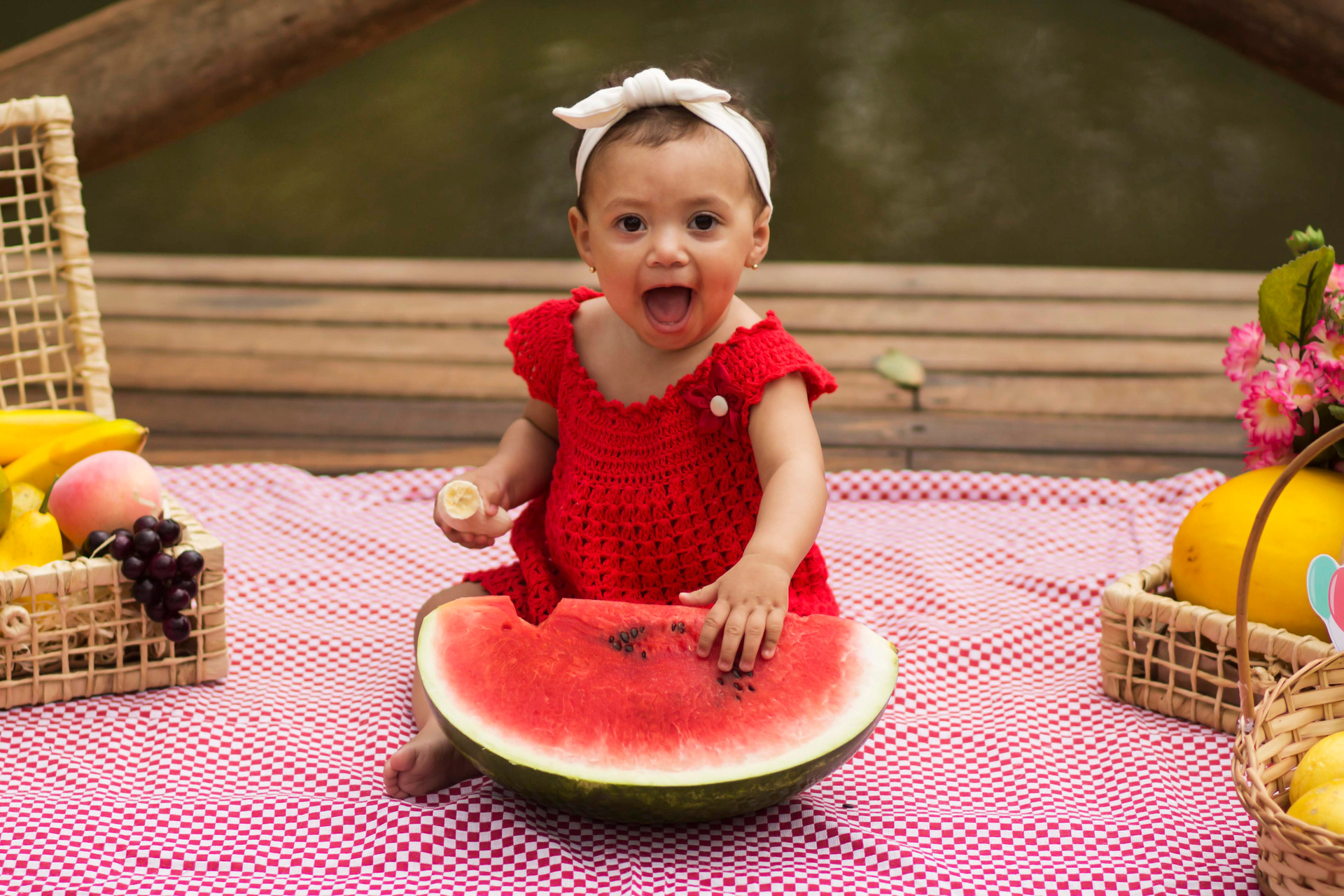 2º Smashe the fruit - é um ensaio parecido com o smashe the cake, porém o bolo é de frutas ou somente com frutas da preferencia da criança, pode ser oferecido frutas que a criança ainda não provou, isso provoca sensações que podem render boas fotos.